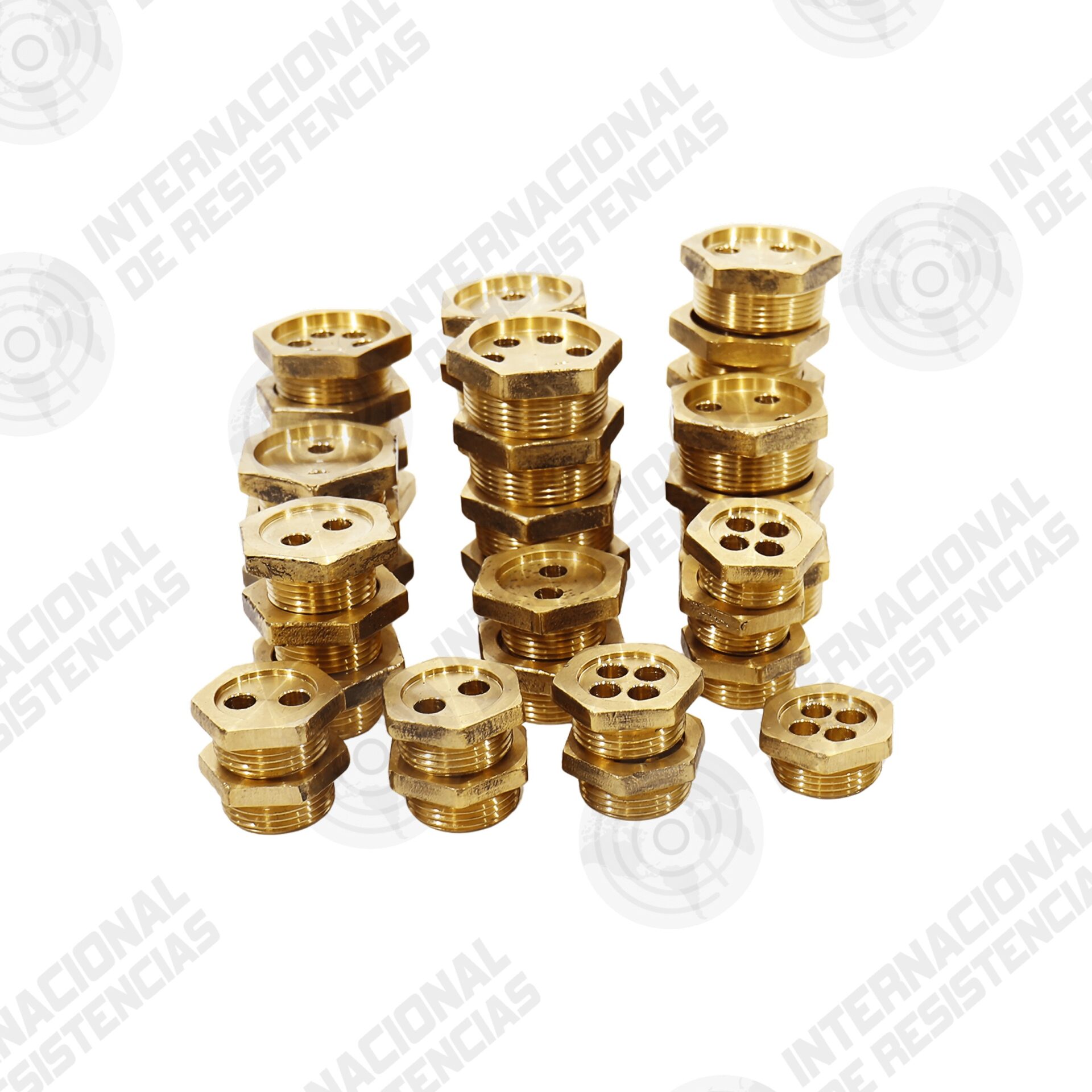 Los flanches en bronce son piezas de montaje y sellado usadas para fijar resistencias tubulares, termocuplas y otros sensores o elementos calefactores en equipos industriales y domésticos. Fabricados en una aleación de cobre y estaño, ofrecen alta resistencia a la corrosión, durabilidad mecánica y estabilidad dimensional a temperaturas y presiones elevadas. Su diseño hexagonal permite un apriete sencillo con llave, mientras que las distintas configuraciones de orificios (3, 4 o 5) se adaptan a la pasaje de bulbos, cables o tubos. Son muy valorados en calderas, calentadores, intercambiadores de calor y sistemas de fontanería.