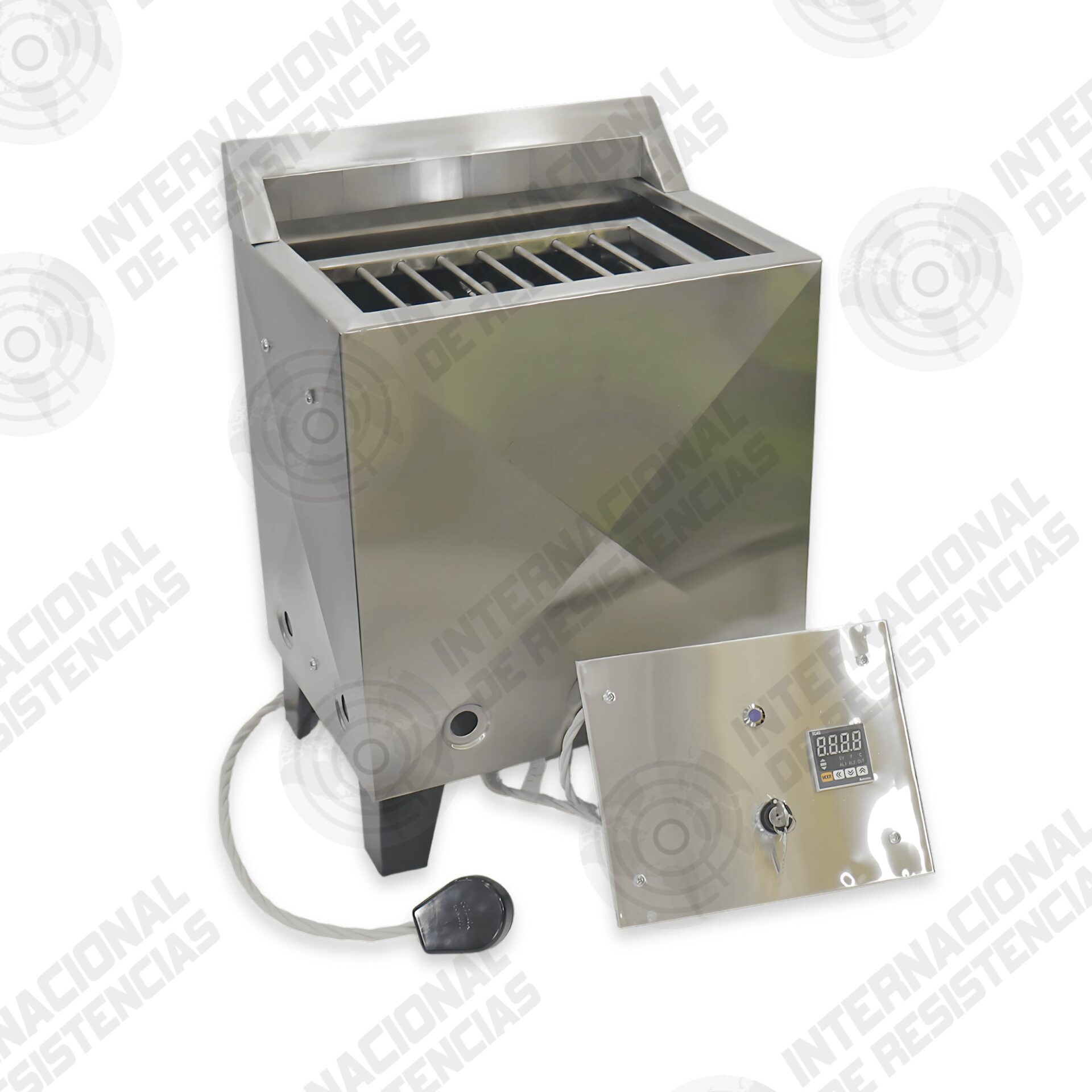 Este generador de calor para sauna está fabricado en acero inoxidable de alta calidad, diseñado para ofrecer un calentamiento rápido, uniforme y duradero en saunas domésticas o comerciales. Su carcasa sólida y resistente a la corrosión protege los elementos calefactores internos y facilita la limpieza. Incluye una caja de control separada equipada con un termostato EGO 30–90 °C y un pirómetro digital ajustable, lo que permite regular la temperatura con precisión y activar el apagado automático en caso de sobrecalentamiento. Disponible en potencias de 3 kW, 6 kW, 9 kW, 12 kW y 18 kW, se adapta a saunas de distintos volúmenes, garantizando una experiencia de calor seco confortable y segura.