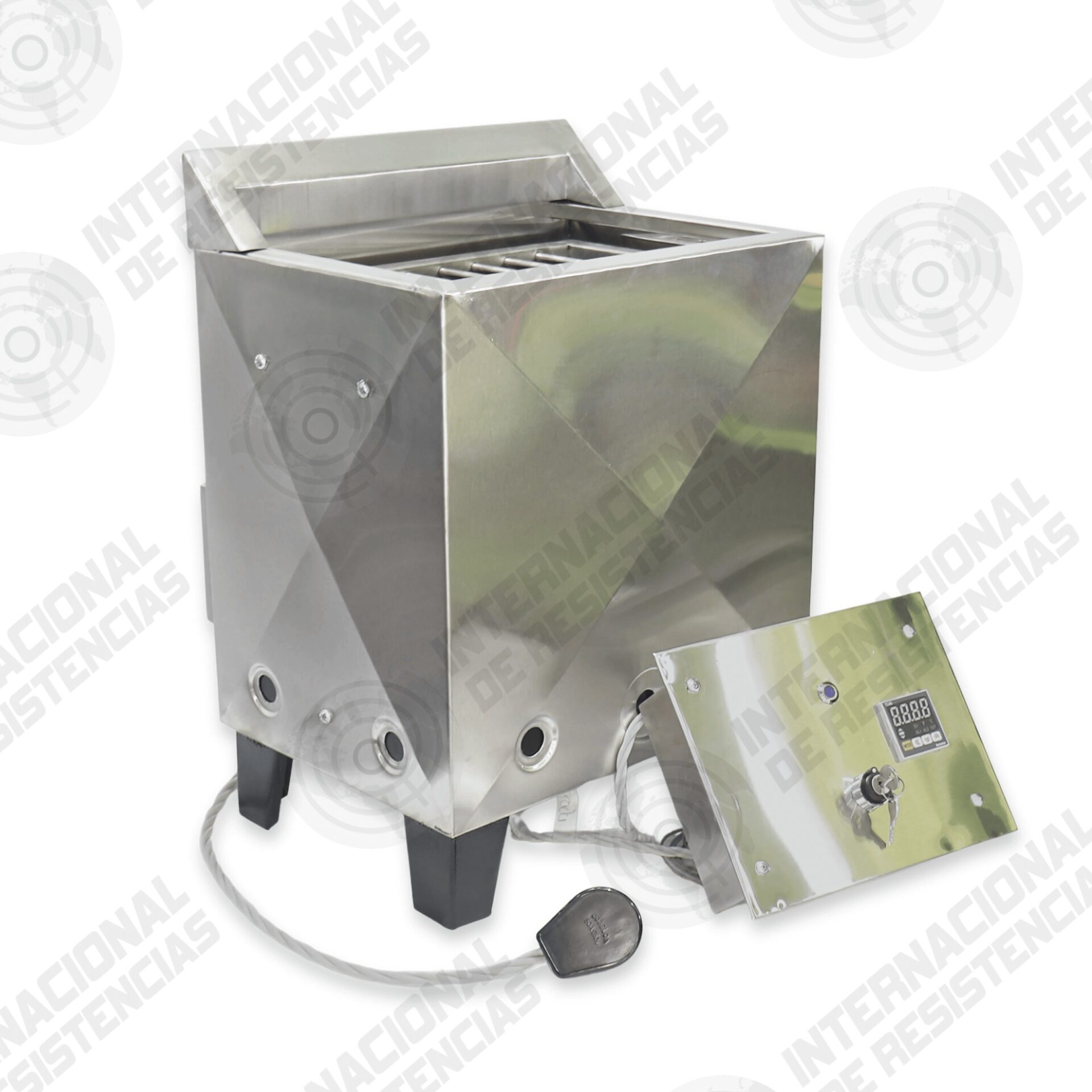 Este generador de calor para sauna está fabricado en acero inoxidable de alta calidad, diseñado para ofrecer un calentamiento rápido, uniforme y duradero en saunas domésticas o comerciales. Su carcasa sólida y resistente a la corrosión protege los elementos calefactores internos y facilita la limpieza. Incluye una caja de control separada equipada con un termostato EGO 30–90 °C y un pirómetro digital ajustable, lo que permite regular la temperatura con precisión y activar el apagado automático en caso de sobrecalentamiento. Disponible en potencias de 3 kW, 6 kW, 9 kW, 12 kW y 18 kW, se adapta a saunas de distintos volúmenes, garantizando una experiencia de calor seco confortable y segura.