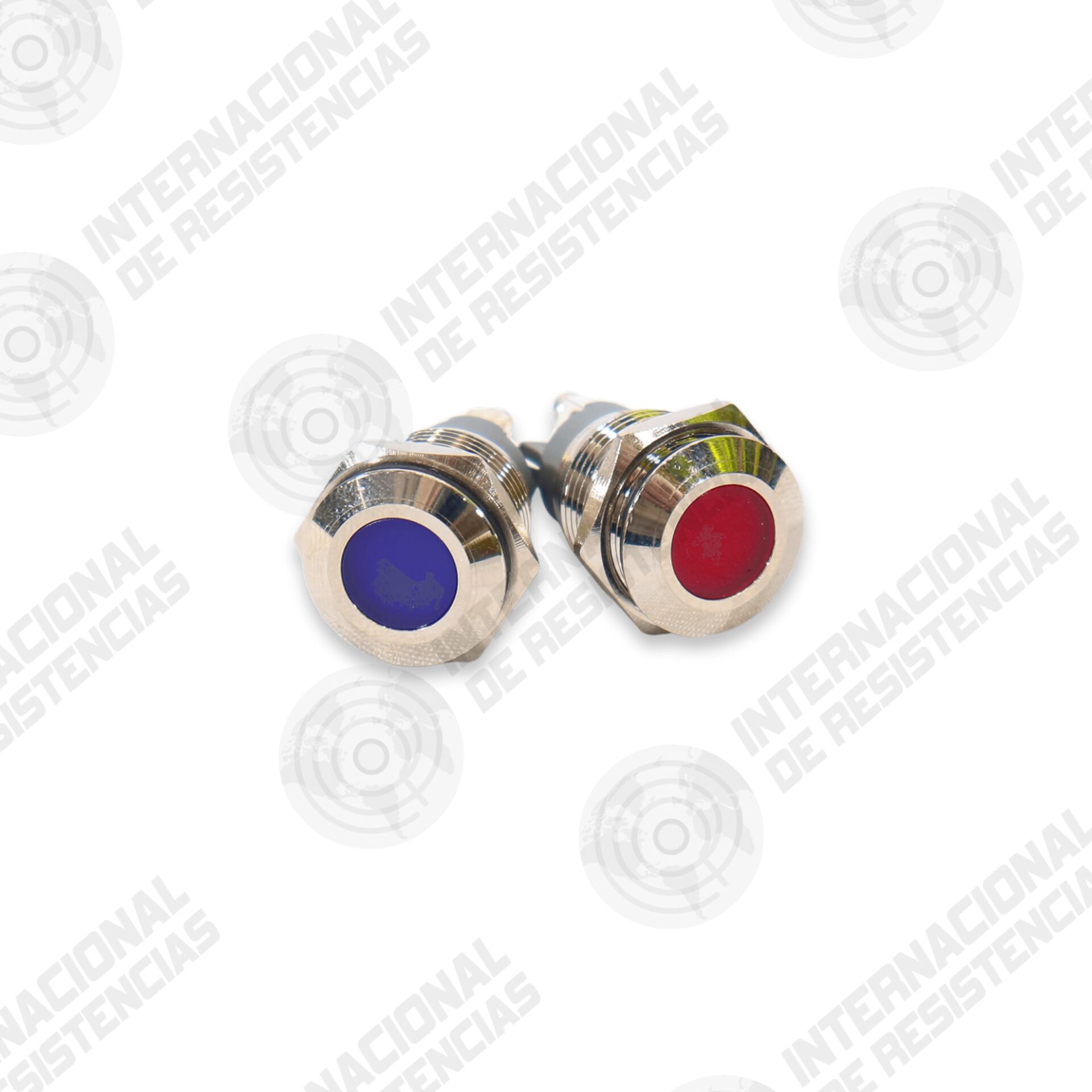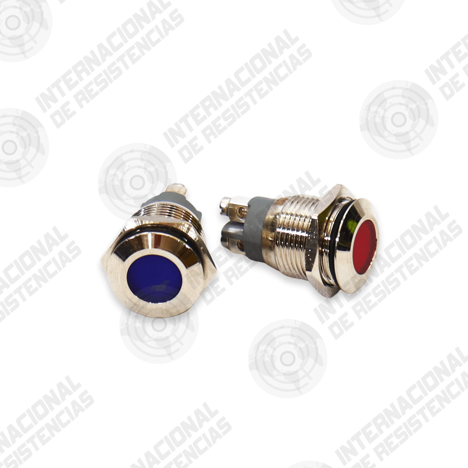 Piloto luminoso de 16 mm de diámetro con cuerpo metálico resistente a golpes, vibraciones y temperaturas extremas. Incorpora un LED de alta intensidad y bajo consumo, disponible en múltiples colores (rojo, verde, azul, amarillo). Se alimenta entre 6 V y 220 V (AC/DC según modelo), con corriente típica < 20 mA. Su montaje se realiza mediante inserción en panel Ø 16 mm y fijación con tuerca. Ideal para señalización de estado en cuadros de control industriales, equipamiento electromecánico y aplicaciones automotrices.