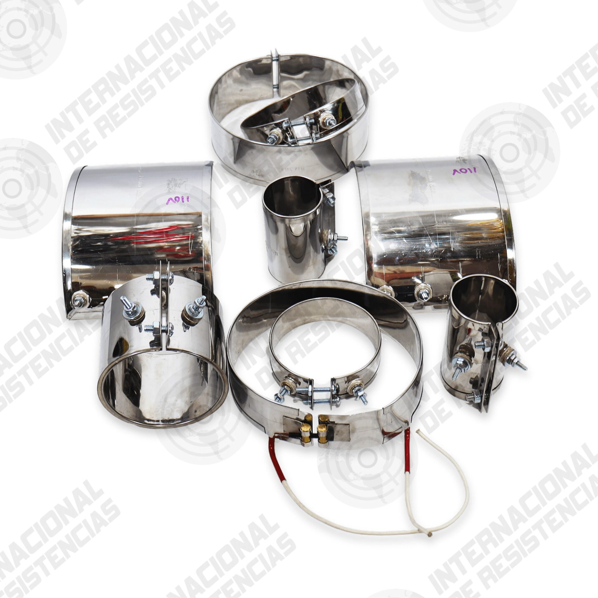 Elemento calefactor de banda/alambre en abrazadera de inox, 100–2 000 W, 220 V/380 V, Ø 10–100 mm.
