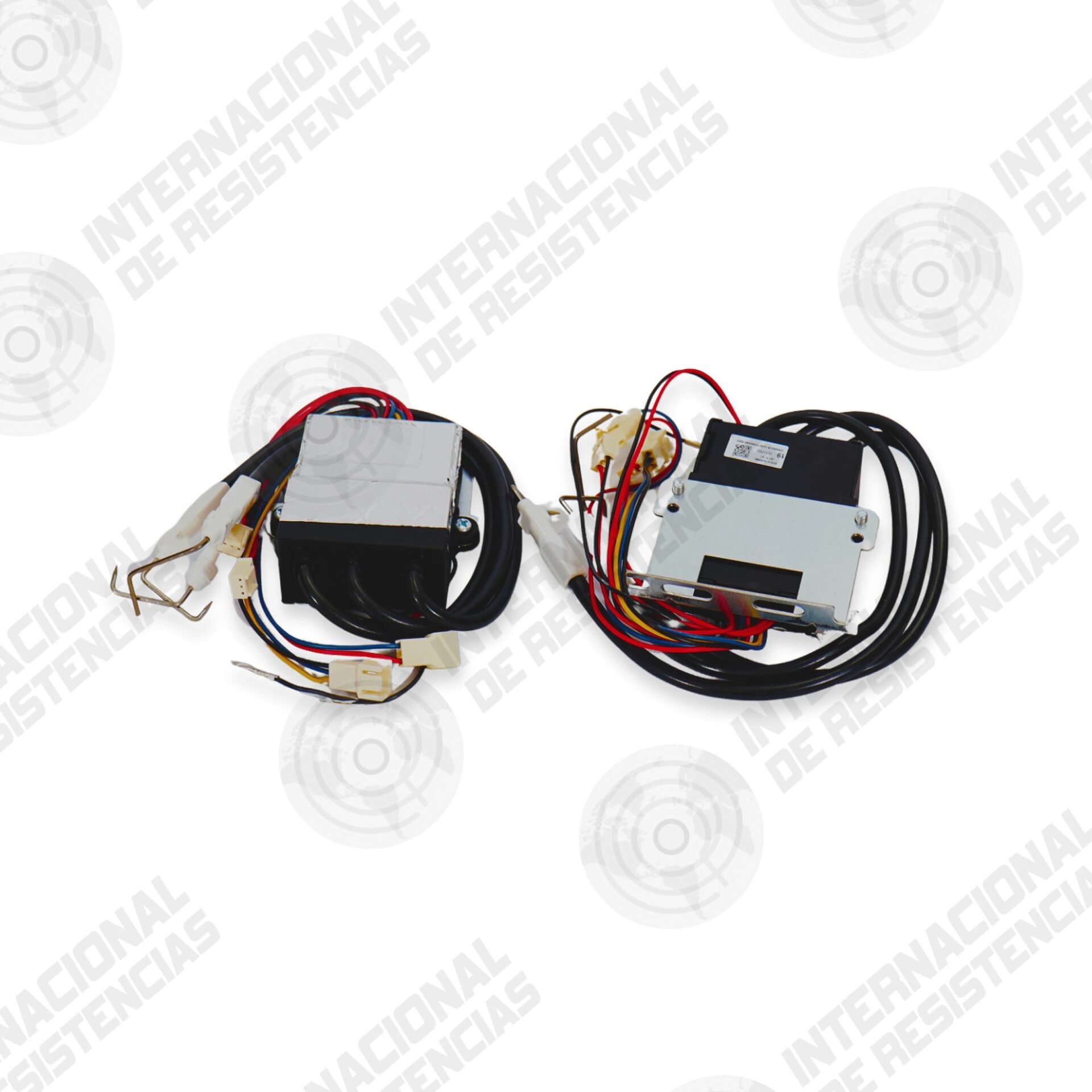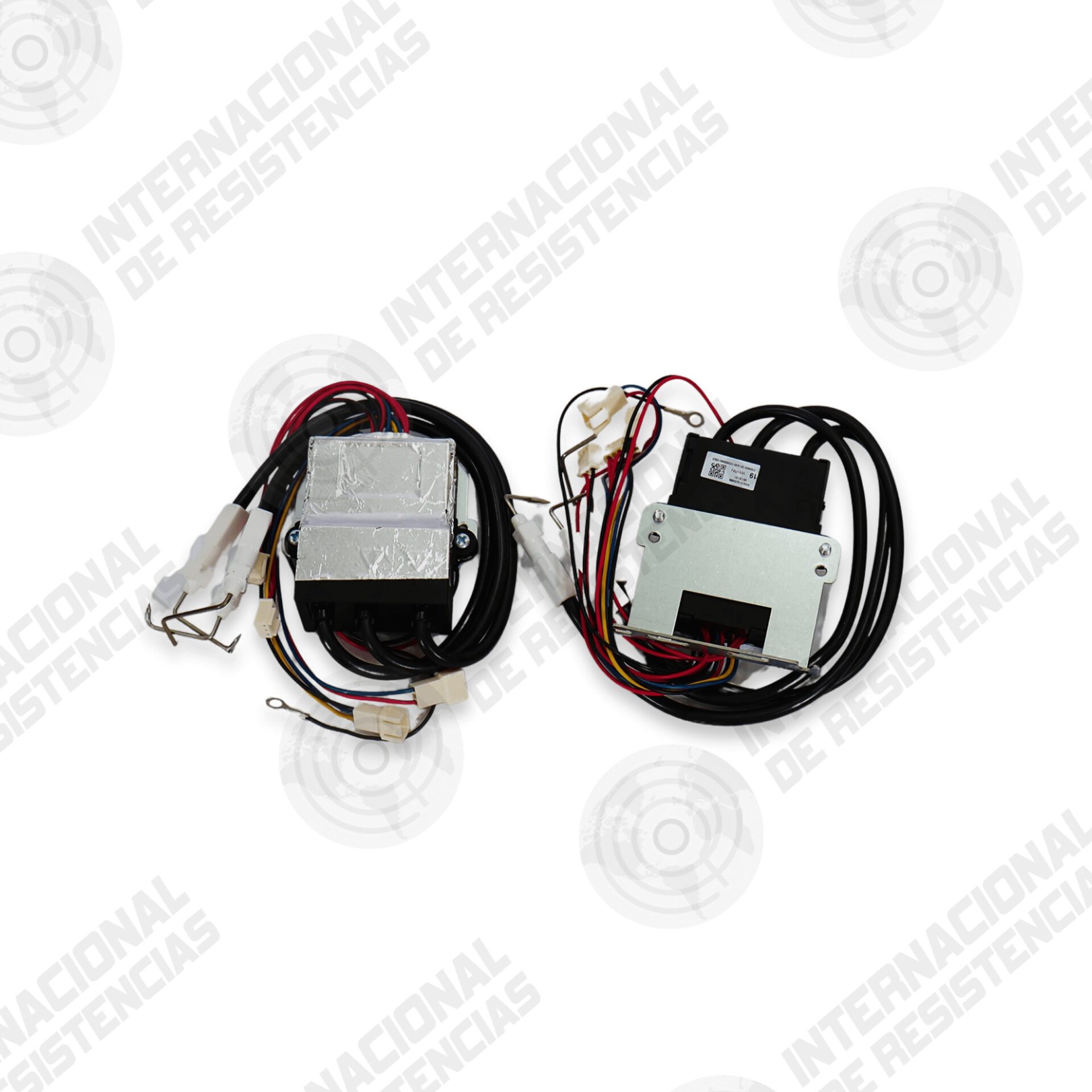 PCB monofásica 230 V AC, transformador 5 kV, relé 10 A, detector de llama, sensor NTC y corte por sobretemperatura.