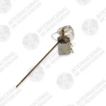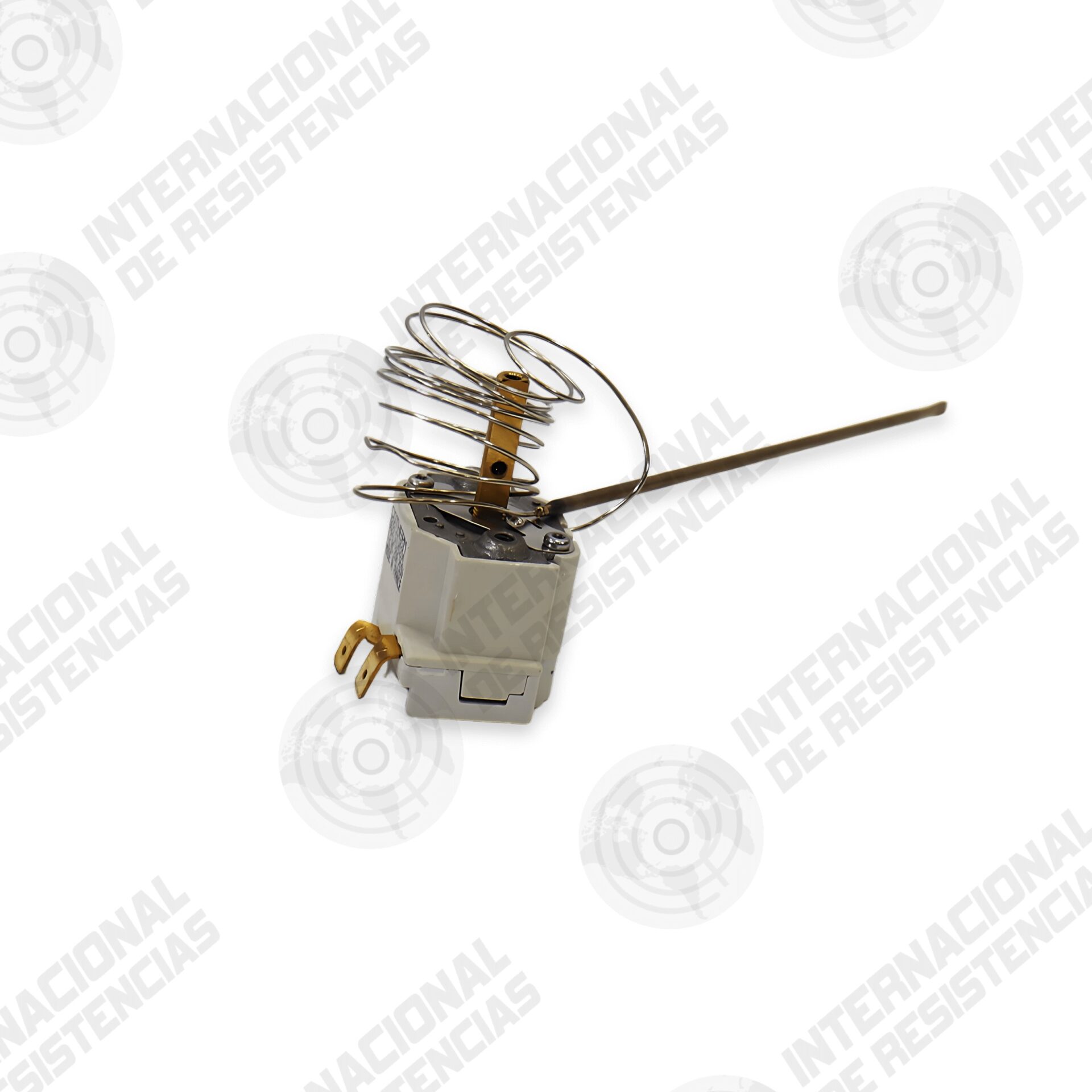 El termostato Cotherm 50 – 300 °C es un controlador de bulbo capilar diseñado para ofrecer un control térmico preciso en hornos, electrodomésticos y procesos industriales. Su bulbo de acero inoxidable (Ø 5 mm × 200 mm) capta la temperatura y la transmite a través de un capilar de 1 m al mecanismo de conmutación SPST, que conmuta hasta 16 A @ 250 VAC. La carcasa robusta resiste el ambiente caliente y húmedo de hornos y cámaras de secado, mientras que la perilla graduada facilita el ajuste rápido de la temperatura. Este termostato garantiza estabilidad y uniformidad térmica, evitando fluctuaciones que puedan afectar la calidad de cocción o los procesos sensibles al calor.