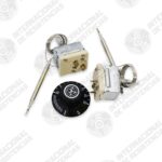 El termostato E.G.O. 30–90 °C es un controlador de temperatura de bulbo capilar diseñado para mantener rangos moderados en aplicaciones culinarias y de proceso ligero. Su sensor de acero inoxidable (Ø 3 mm × 150 mm) transmite la lectura por un capilar de 36″ (914 mm) al mecanismo SPST de acción rápida, que conmuta cargas hasta 16 A @ 250 VAC. La carcasa compacta y el dial negro grabado facilitan la instalación en paneles de cocción, hornos tostadores, freidoras y baños maría, mientras que su construcción robusta garantiza un funcionamiento preciso y duradero bajo condiciones de calor constante.