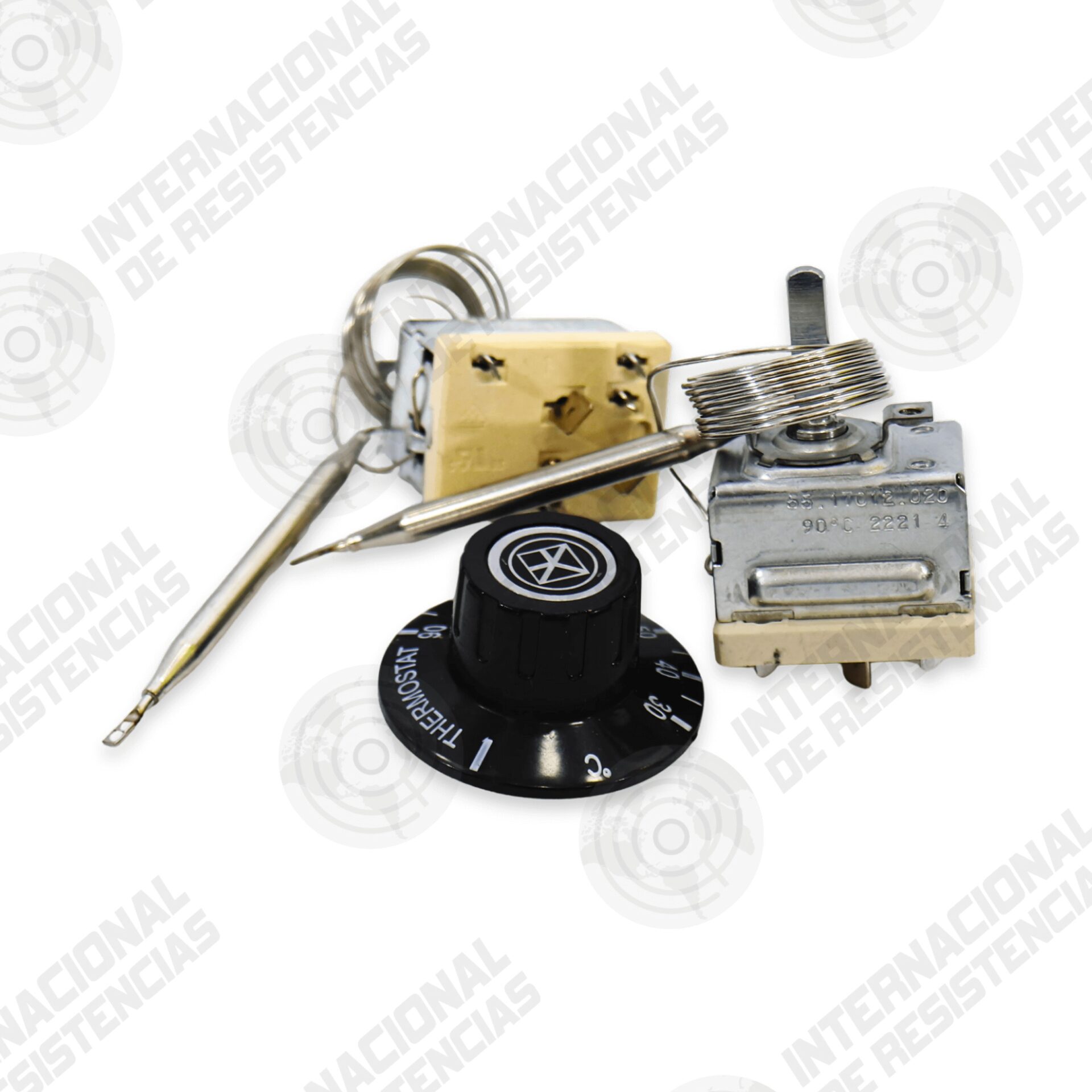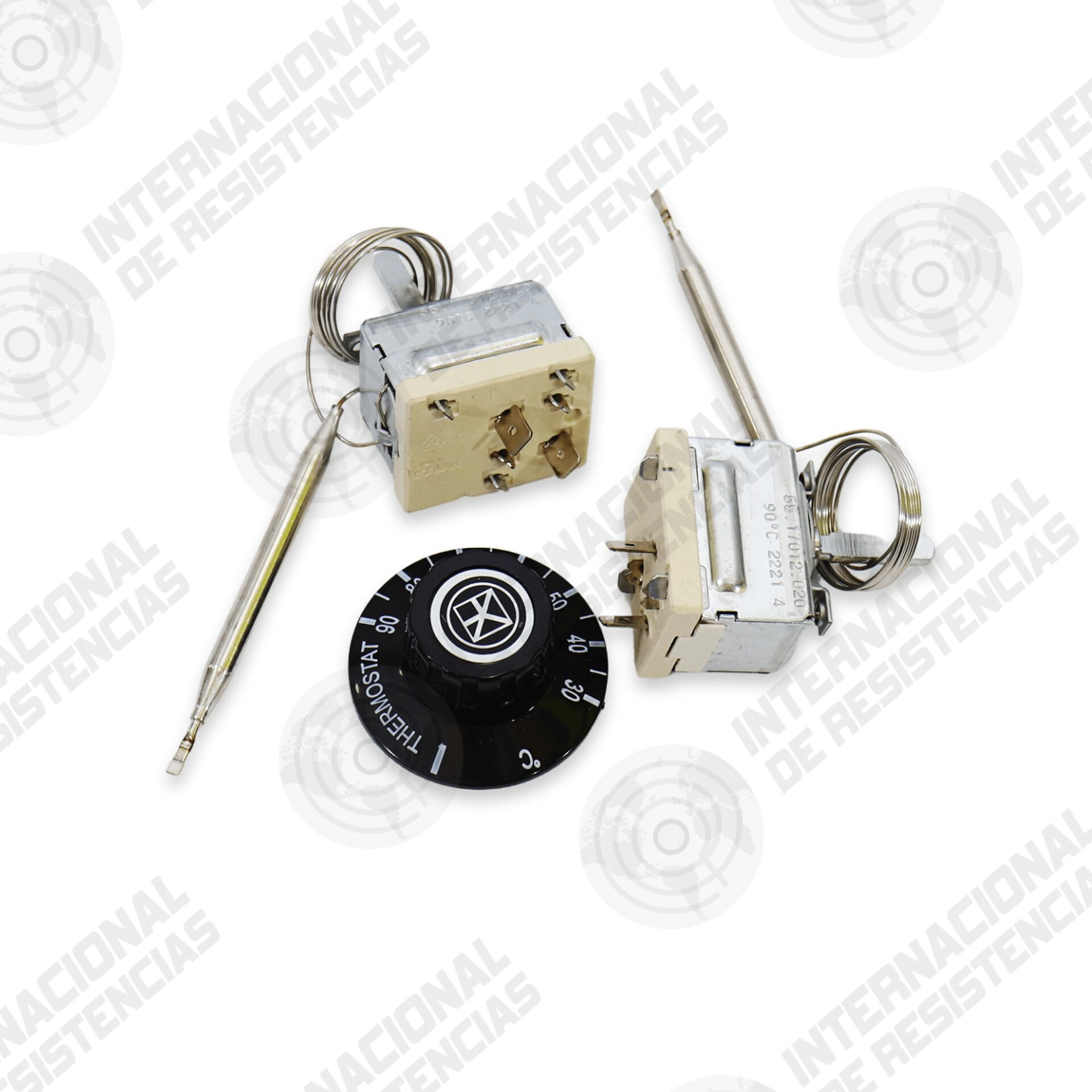 E.G.O. 30–90 °C — SPST 16 A@250 VAC, bulbo Ø 3 × 150 mm, capilar 914 mm, diferencial ≈ 5 °C, montaje panel Ø 22 mm.