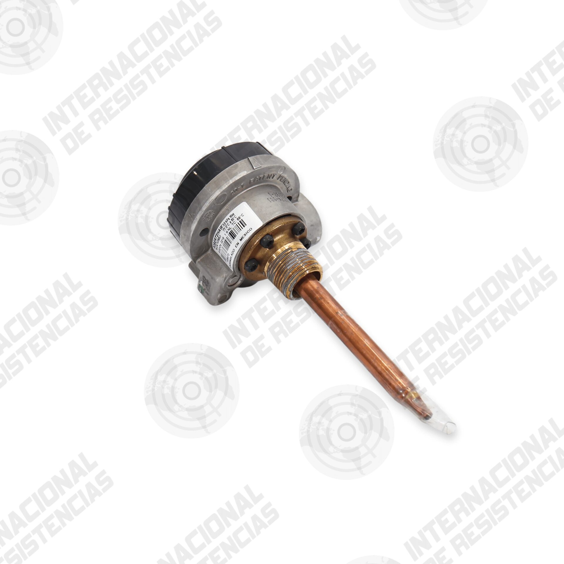 Termostato acumulación — sonda 8″ × 5/16″, 120-180 °F, shut-off de seguridad 190 °F, rosca ¾″-14 NPT, dial manual OFF-PILOTO-ENCENDIDO.