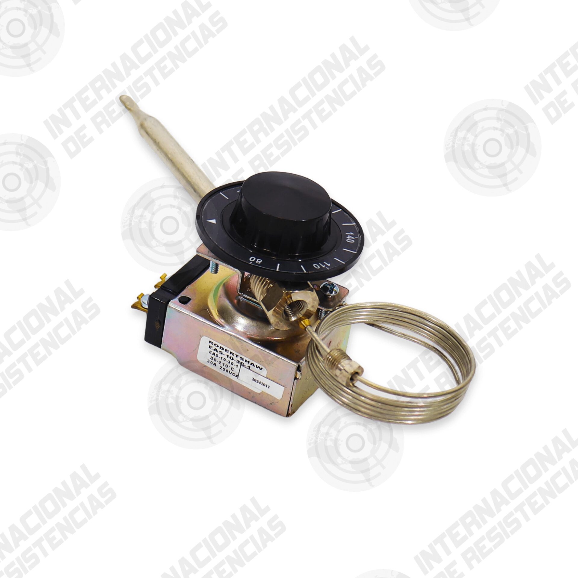 El Robertshaw EA5-10-36-1 es un termostato de bulbo capilar diseñado para aplicaciones industriales que requieren un control fiable y preciso a temperaturas elevadas, hasta 210 °C. Incorpora un contacto SPST de acción rápida soportando hasta 30 A @ 250 VAC, ideal para conmutar resistencias de hornos, calderas y equipos de procesamiento térmico. Su bulbo sensor de acero inoxidable (Ø 4,8 mm × 281 mm) y capilar de 36 ″ (914 mm) transmiten con exactitud la temperatura al mecanismo interno, que abre y cierra el circuito con un diferencial de ≈ 10 °C para evitar ciclos excesivos. Montado en carcasa metálica resistente, integra una perilla frontal graduada y bornes de latón robustos, garantizando durabilidad en ambientes de alta temperatura, polvo y vibraciones.